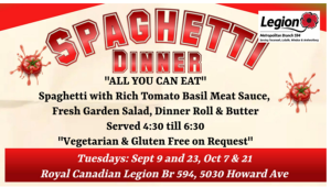 On Tuesday 16 December, we will be having our annual Christmas Spaghetti Get-Together at Legion 594 (Howard Ave), which coincides with that Legion’s bi-weekly all-you-can-eat spaghetti dinner that is open to the public. Please remember that we will NOT be meeting at the Hospice on Tuesday 9 December.